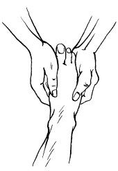 Обхватывают стопу обеими руками, медленно перемещают руки, двигаясь по направлению к пальцам.