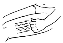 Если условия не позволяют это сделать, руки протирают спиртовым раствором. Для того чтобы они были мягкими, хорошо скользили по телу и не раздражали кожу, на них следует нанести детскую присыпку, тальк, рисовую пудру или специальные смазывающие вещества: массажное масло, детский или косметический крем. Лучшим средством при массаже больших поверхностей тела (спины, грудной клетки, бедер) является тальк, который обладает прекрасными впитывающими свойствами (абсорбирует пот, кожный жир), делает кожу гладкой, не вызывает аллергической реакции. После сеанса самомассажа тальк следует аккуратно удалить чистой салфеткой. Выполняя самомассаж на небольших участках тела (кистях, суставах, голенях), нежелательно применять в качестве смазывающего средства борный вазелин, так как он закупоривает поры и ухудшает дыхание кожи.