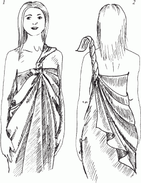 Этот вариант позволяет замаскировать полные бедра и талию и привлечь внимание к красивым плечам. Для завязывания вам понадобится парео большого размера или отрез тонкой ткани размером 120 x 300 см.
