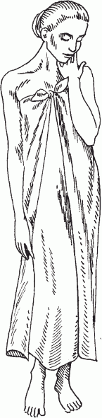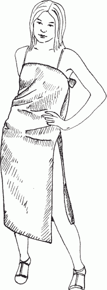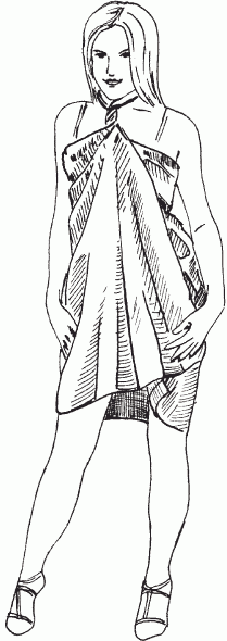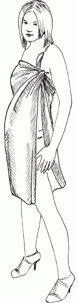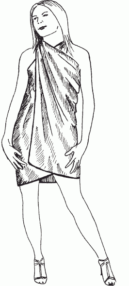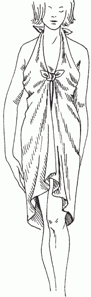 Эта модель немного похожа на предыдущую, но, в отличие от нее, парео завязывается, а не скрепляется с помощью булавки. В результате оно собирается на груди складками, расходящимися книзу. Таким способом вы можете завязать парео любой длины.