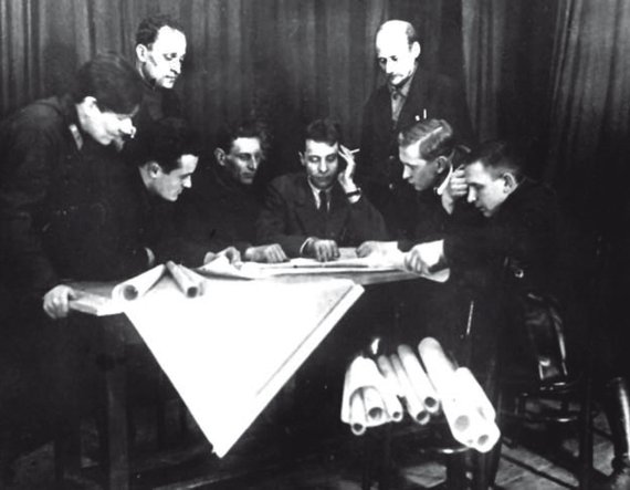 Члены ГИРД обсуждают проект ракетоплана, слева направо: Н.В. Сумарокова, И.П. Фортиков, С.П. Королев, А. Левицкий, Б.И. Черановский, Ф.А. Цандер, ЮА. Победоносцев, Заботин