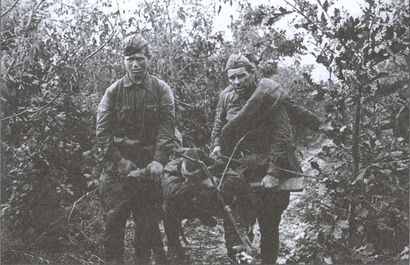 Начало октября 1941 года войска Юго-Западного направления (Южный и Юго-Западный фронты) встретили тяжелыми оборонительными боями. На снимке бойцы Красной Армии выносят раненого товарища с поля боя. Южный фронт, осень 1941 года (АВЛ)