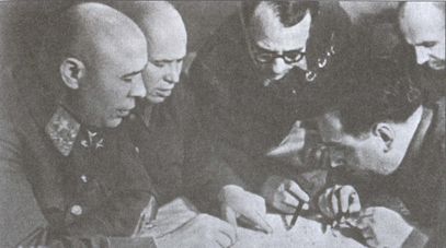 В штабе Южного фронта планировали разгром 1-й танковой армии Клейста. Слева направо: командующий Юго-Западным направлением Маршал Советского Союза С.К. Тимошенко, член Военного совета ЮЗН Н.С. Хрущев, командующий Южным фронтом Я.Т. Черевиченко, начальники штабов И.Х. Баграмян, А.И. Антонов. 1941 год (ABЛ)