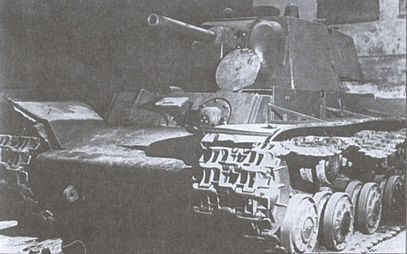 КВ-1 на ремонтном заводе. Эта машина выпуска августа 1941 года с дополнительным бронированием корпуса (25-мм бортовые экраны увеличенной высоты для защиты погона башни). На месте фар — заглушка. Южный фронт, декабрь 1941 года (УДАКФД)