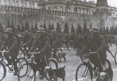 Чтобы уничтожить как можно больше немецких танков, предполагалось привлечь к наступательной операции под Ростовом довольно экзотическое оружие — собак-подрывников, которые должны были приносить взрывное устройство к боевой машине противника. На снимке — собаки инженерных войск на параде. Москва, Красная Площадь, 7 ноября 1938 года (РГАКФД)