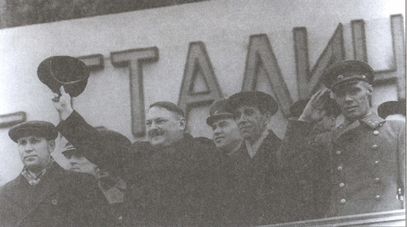 Секретарь партийной организации города Ленинграда А.А. Жданов (в центре) приветствует части Ленинградского военного округа и трудящихся города на параде в честь годовщины революции. Впоследствии он стал членом Военного совета Ленинградского фронта. Крайний справа — генерал-лейтенант М.М. Попов — командующий войсками ЛВО, впоследствии, с началом войны, командующий Северным фронтом. Ленинград, 7 ноября 1940 года (АВЛ)