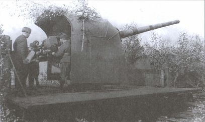 130-мм железнодорожная установка Б-57 в готовности к открытию огня по позициям противника. 130-мм морская пушка устанавливалась на бронированную четырехосную платформу. Подобные артсистемы использовались только на Ленинградском фронте. Октябрь 1941 года (АВЛ)