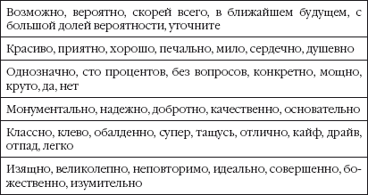 Вспомните, пожалуйста, какие слова из приведенных ниже в таблице вы употребляете в речи чаще других. Перед наиболее часто употребляемыми вами словами поставьте 1; перед группой слов, которые употребляются реже всего, – 6, цифры от 2 до 5 расставьте в зависимости от частоты употребления (имеются в виду слова, употребляемые вами в разговорной речи).