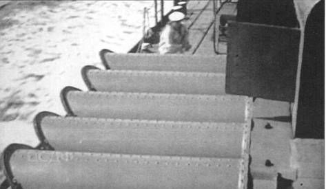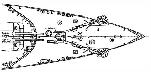 – автоматы № 1 и № 2, располагавшиеся на срезе полубака по бортам, не обеспечивали безопасность офицера, управлявшего огнём зенитной артиллерии, который находился на открытом мостике у прибора № 15А; давление конуса дульных газов при этом превышало нормативное значение на 0,2 кгс/см 2.