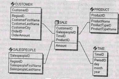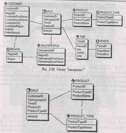 В примере на рис. 2.87 таблица SALE - таблица факта; CUSTOMER, TIME, SALESPEOPLE и PRODUCT - таблицы размерности, которые позволяют быстро извлекать информацию о том, кто и когда сделал покупку, какой продавец и на какую сумму продал и какие именно товары были проданы.
