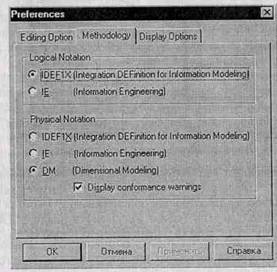Для физического уровня выбрана методология DM (Dimensional Modeling). Эта опция устанавливается в закладке Methodology диалога Preferences (меню Option/Preferences), рис. 2.91. При этом показываются иконки размерности для таблиц. В списке выбора в левой части панели инструментов физический уровень показывается как Dimensional и изменяется вид палитры инструментов на физическом уровне (рис. 2.92).