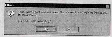ERwin автоматически проверяет корректность размерной модели и выдает диалог с предупреждающим сообщением в случае следующих нарушений синтаксиса:
