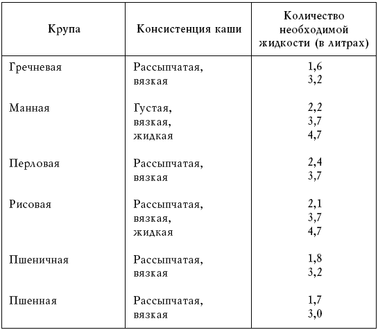 По степени густоты все каши можно разделить на рассыпчатые, густые и вязкие. Первые чаще всего готовят на воде, хотя можно использовать грибной или овощной бульон. Вязкие и густые каши обычно варят на цельном или разведенном молоке. Для приготовления каши нужной консистенции необходимо знать соотношение между объемом сухой крупы и количеством применяемой жидкости (табл. 1).