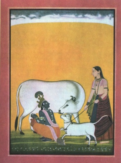 Кришна доит корову. Иллюстрация к «Бхагавата-пуране». Миниатюра школы Басоли (Северная Индия), середина XVII в.