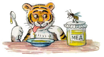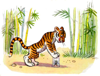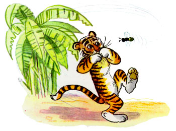 Полосатик Жужулю не заметил. Читает. Подпрыгивает от восторга. Надоело Жужуле на чужую радость глядеть — и принялась она вокруг Полосатика кружиться и жужжать. Тут тигренок заметил Жужулю и спрашивает: