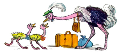 Повесила мама Ама на шею кожаный саквояж и ушла, хотя ей было очень жалко оставлять страусят одних дома.