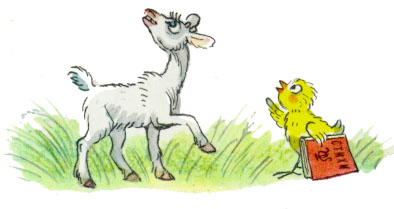 Козленок Мармеладик подошел к цыпленку Фью и стал прощаться.