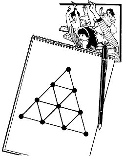 Наш учитель — настоящий фанат геометрии — задал сегодня на дом эту головоломку. Из нарисованной фигуры, где полно треугольников, надо убрать четыре отрезка, чтобы осталось всего пять треугольников.