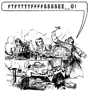 Именно сейчас он, кажется, опять близок к победе в конкурсе обжор «Пир или чума», который ежегодно проходит в кабачке Фрэнсиса. Вот только неясно, что же он пытается сказать с набитым-то ртом. Попробуйте подставить две недостающие буквы в загадочную фразу и… Вдруг вы услышите крик о помощи?