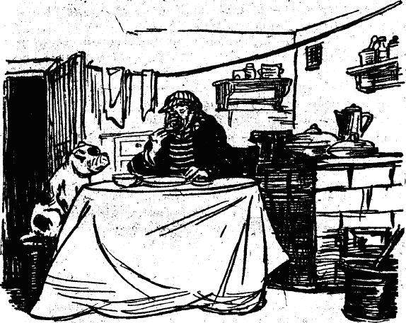 — Вот наказание! — ворчит отец, с трудом отрывая голову от подушки. — Вечно ей мерещатся какие-то шорохи. Вы, женщины, для того, видно, и ложитесь в постель, чтобы слушать, не крадется ли вор. — Однако для ее спокойствия он натягивает брюки и носки и спускается в кухню. Тут он убеждается, что на этот раз мать была права: в доме действительно вор, окно кладовой растворено, в кухне свет. Отец подкрадывается к приотворенной двери и заглядывает в кухню. Там за столом сидит вор и уплетает холодный ростбиф, закусывая огурчиками, а около него, заглядывая ему в лицо с преданной улыбкой, от которой волосы встают дыбом, сидит этот четвероногий идиот и виляет хвостом.