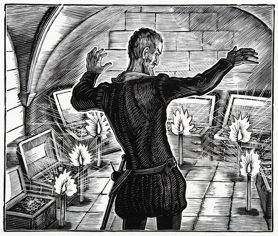 Ступайте, полно вам по свету рыскать, Служа страстям и нуждам человека. Усните здесь сном силы и покоя, Как боги спят в глубоких небесах... Хочу себе сегодня пир устроить: Зажгу свечу пред каждым сундуком, И все их отопру, и стану сам Средь них глядеть на блещущие груды.(Зажигает свечи и отпирает сундуки один за другим.)