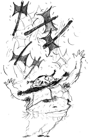 После окончания сражения Славным Воинам Племени Лохматых Хулиганов было роздано не менее двадцати «Черных Звезд» [3] . И это неудивительно, ибо викинги в той схватке проявляли такое Воинское Мастерство — любо-дорого смотреть! Награды эти были также данью уважения старому солдату Брехуну Крикливому, научившему доблестных воинов всему, что они знали. Вот, полюбуйтесь, в дальнем углу палубы Червяк Безмозглый исполняет сложнейший прием под названием «Танец С Топорами», заключающийся в том, что пират с бешеной скоростью крутит над головой сразу два боевых топора. Он перекидывает их из руки в руку, гипнотизируя противника и приводя его в замешательство, а потом неожиданно наносит смертельный удар.