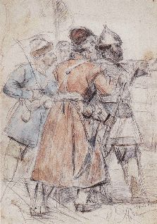 Все это сделалось вашим воровством и изменою: если бы вы нам служили, то вы бы казаков в это время на войну не посылали, а послали бы их и своих людей из острогов Пермскую землю оберегать. Мы послали в Пермь Воина Оничкова, велели ему этих казаков, Ермака с товарищами, взять и отвести в Пермь и в Камское Усолье, тут велели им стоять, разделясь, и зимою на нартах ходить на пелымского князя вместе с пермичами и вятчанами; а вы, обославшись с Пелепелицыным и Оничковым, посылали бы от себя воевать вогуличей и остяков. Непременно по этой нашей грамоте отошлите в Чердынь всех казаков, как только они к вам с войны возвратятся, у себя их не держите; а если для неприятельского прихода вам в остроге пробыть нельзя, то оставьте у себя немного людей, человек до ста, с каким-нибудь атаманом, остальных же всех вышлите в Чердынь непременно тотчас. А не вышлете из острогов своих в Пермь волжских казаков, атамана Ермака Тимофеева с товарищами, станете держать их у себя и пермских мест не будете оберегать и если такою вашею изменою что вперед случится над пермскими местами от вогуличей, пелымцев и от сибирского салтана, то мы за то на вас опалу свою положим большую, атаманов же и казаков, которые слушали вас и вам служили, а нашу землю выдали, велим перевешать".