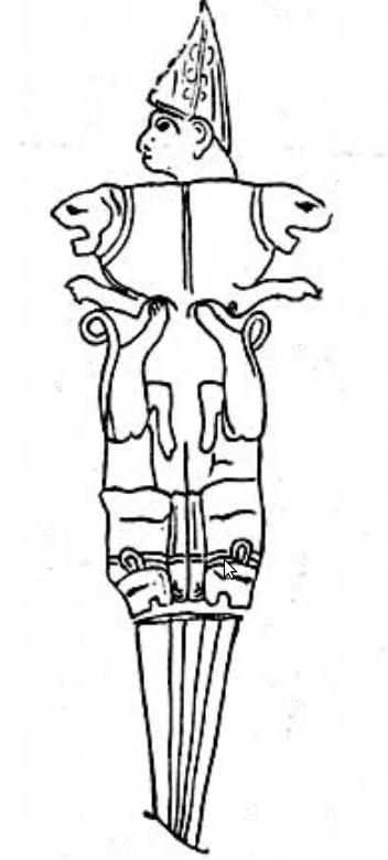 Одна из фигур заслуживает особого упоминания; это — «бог-меч» в боковой галерее Язылыкая (рис. 9). Скульптура изображает короткий меч, рукоять которого имеет вид четырех припавших львов, попарно расположенных вдоль обоюдоострых лезвий меча; два льва расположены вдоль лезвий и смотрят в сторону острия меча; два других расположены поперек меча, срезанными задами друг к другу. Железный топор с похожей рукояткой был найден в Рас — Шамре в Сирии. Высказывалось мнение, что меч, изображенный в Язылыкая, был военным трофеем, захваченным у сирийского или митаннийского противника, поскольку не существует свидетельств о том, что хетты пользовались такими мечами. Но как же быть с человеческой головой, венчающей всю скульптуру? На этой голове типичная коническая шапка хеттских богов, на топоре же, найденном в Рас — Шамре, голова отсутствует. Из положения фигуры в скальном храме ясно следует, что эта фигура изображает божество; более того, мы сейчас можем уточнить: это божество подземного мира, ибо, согласно недавно обнаруженным текстам, группа божеств подземного мира изображалась в виде мечей.
