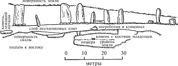 Мы считаем, что такими центрами прежде всего стали древние святилища кочевников, связанные с культом предков – основателей племен. Возможно, это были древние святилища аморейских племен, поселившихся на этих землях около 2000 года до н. э. К ним относится известный культовый центр в Гезере. Там находились восемь или, возможно, одиннадцать монолитов из песчаника, расположенных полудугой, вытянутой в направлении с севера на юг длиной около десяти метров. Все монолиты, за исключением одного, установленного в каменном углублении, расположены на квадратной каменной платформе, приподнятой над уровнем земли.