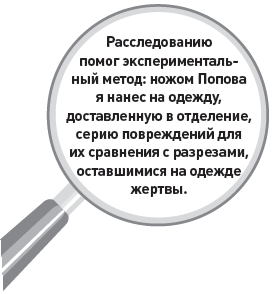 Расследованию помог экспериментальный метод: ножом Попова я нанес на одежду, доставленную в отделение, серию повреждений для их сравнения с разрезами, оставшимися на одежде жертвы.