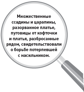 Множественные ссадины и царапины, разорванное платье, пуговицы от кофточки и платья, разбросанные рядом, свидетельствовали о борьбе потерпевшей с насильником.