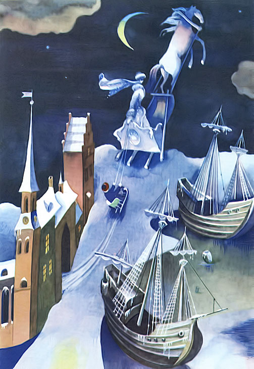 На площади каталось множество детей. Те, что были посмелее, привязывали свои санки к крестьянским саням и уезжали таким образом довольно далеко. Веселье так и кипело. В самый разгар его откуда-то прикатили большие сани, выкрашенные в белый цвет. В них сидел человек, укутанный в белую меховую шубу и с такой же шапкой на голове. Сани объехали кругом площади два раза; Кай живо привязал к ним свои санки и покатил. Большие сани понеслись быстрее и затем свернули с площади в переулок. Сидевший в них человек обернулся и дружески кивнул Каю, точно знакомому. Кай несколько раз порывался отвязать свои сани, но человек в шубе кивал ему, и он ехал дальше. Вот они выехали за городские ворота. Снег повалил вдруг хлопьями, стемнело так, что кругом не было видно ни зги. Мальчик поспешно отпустил веревку, которою зацепился за большие сани, но санки его точно приросли к большим саням и продолжали нестись вихрем. Кай громко закричал — никто не услышал его! Снег валил, санки мчались, ныряя в сугробах, прыгая через изгороди и канавы. Кай весь дрожал, хотел прочесть «Отче наш», но в уме у него вертелась одна таблица умножения.