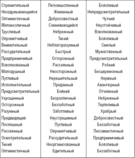 Методика диагностики избегания неудач состоит из набора слов, разбитых на три колонки. В каждой строке (а строк всего 30) можно выбрать только одно слово, которым можно определить характер человека. Тестируемые должны выбрать слово, наиболее точно характеризующее его личные качества.