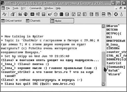 Любой канал – это прежде всего компания старожилов, определяющих его «политику». Как правило, все посетители каналов IRC великолепно знают друг друга и «врубиться» в их беседу новичку не всегда просто.