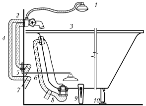 Затем производят подключение сифона к трубе канализации. Далее, используя гибкую подводку, присоединяют к трубам горячей и холодной воды смеситель с душем. Все соединения выполняют с применением герметика.