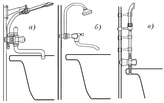 Старые модели душевых кабин 1990-х гг. содержат смесители в комплекте с металлорукавом, имеющим рассекатели (лейку) на конце. Новые модели душевых кабин имеют более надежные гибкие пластиковые шланги в капроновой оплетке.