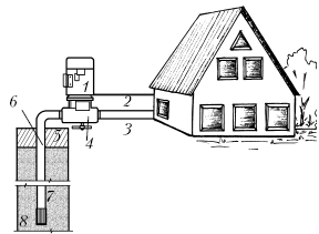 Рис. 38. Подача воды из скважины в дом при самоизливе через стальную задвижку с электроприводом: 1 – электродвигатель (привод); 2 – электрокабель; 3 – труба; 4 – задвижка стальная; 5 – герметичный оголовок; 6 – труба для подачи воды; 7 – скважина; 8 – фильтр