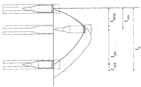 На приводимых циклограммах работы различных систем автоматики используются следующие обозначения: tц – время цикла автоматики, tотп – время отпирания канала ствола, tэкстр – время извлечения и удаления стреляной гильзы, tотх – время отхода подвижных деталей в крайнее заднее положение, tвозвр – время возвращения подвижных деталей в переднее положение, 1дос – время досылания патрона в патронник, tзап – время запирания канала ствола, tудм – время работы ударного механизма.