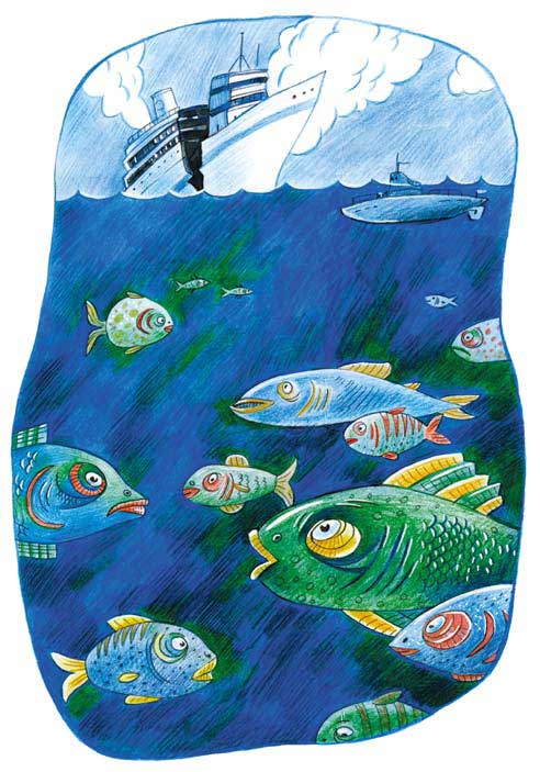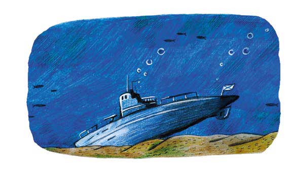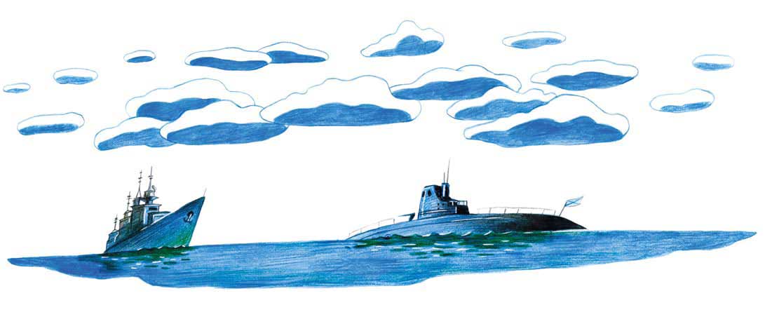 Но если на горизонте показывался дым из труб вражеских кораблей, приходилось забывать обо всём. «Боевая тревога! Срочное погружение!» — громко приказывал Командир. И каждый моряк в команде «Малютки» знал, что ему делать. Мотористы останавливали дизель — этот мощный двигатель не может, к сожалению, работать под водой. Торпедисты готовили к стрельбе грозные торпеды. Электрики включали электромоторы, и лодка быстро уходила под воду, оставляя наверху только специальную трубу с зеркалами внутри — перископ. Через него «Малютка» и Командир видели всё, что происходит на поверхности моря.