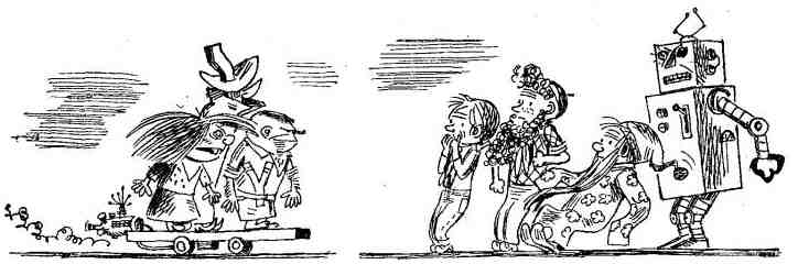 — Ну, это вроде электрических пробок, — объяснил Миша. — Скажем, только ты думаешь совершить какой-нибудь проступок, они моментально срабатывают: раздаётся звонок или загорается цветная лампочка. Это значит: «Стой! Подумай! Прекрати!..» — Миша немного смутился и добавил: — Конечно, это только для тех, кто не достиг совершеннолетнего возраста. Взрослым они не нужны… Да, интересно знать, где сейчас обитают такие огромные Зазнай, Лени и Неучи?