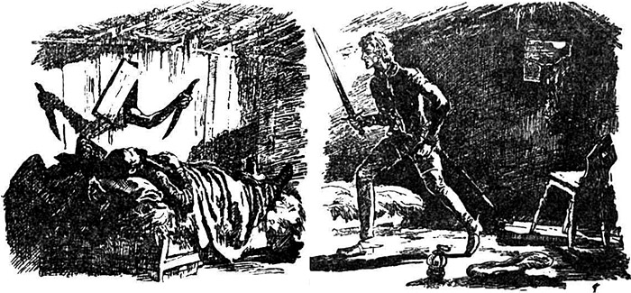 В слабом свете была видна фигура человека с ножом в руке. За ним виднелась еще одна. Теперь уже Питер не мог скрыться через чердачное окно: если бы он попытался сделать это, то получил бы удар в спину. Питер сжал обеими руками меч и прыгнул на противника. Меч, по-видимому, достиг цели: человек свалился на пол и остался недвижим. Второй уже опирался коленкой о край люка. Удар меча, и тот тоже свалился вниз, на головы стоявших ниже. Лестница рухнула. В результате нападавшие оказались в куче на полу. Только один удержался руками за край люка. Питер захлопнул крышку, и человек с диким криком полетел вниз. За неимением ничего другого Питер навалил на крышку люка труп убитого им человека.