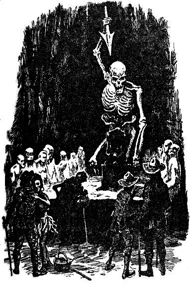 Действительно, зрелище было страшное. На дальнем конце длинного каменного стола, держа в костлявых пальцах огромное белое копье, сидела сама Смерть в виде колоссального человеческого скелета, более пятнадцати футов высотой. Высоко над головой она держала копье, как бы собираясь нанести удар. Другой костлявой рукой она опиралась на каменный стол, как человек, поднимающийся с своего сиденья, а весь скелет наклонился вперед, так что его шейные позвонки и ухмыляющийся блестящий череп были напряженно вытянуты в нашу сторону. Пустые глазницы скелета были устремлены на нас, а челюсти немного разомкнуты, как будто он вот-вот заговорит.