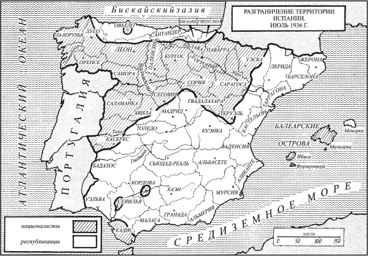 К 21 июля можно было провести приблизительную границу между районами, где мятеж в целом увенчался успехом, и теми, где он большей частью провалился. Начинаясь с середины испанско-португальской границы, эта линия шла в северо-западном направлении, где недалеко от Мадрида поворачивала к юго-западу, к горам Гвадаррамы, а затем шла к Теруэлю (примерно в ста милях от Средиземного моря в Арагоне), поднималась на север к Пиренеям и завершалась на испано-французской границе примерно на середине ее протяженности. Кроме узкой полоски побережья, включающей в себя Астурию, Сантандер и две прибрежные провинции Басконии, все к северу и западу от этой линии стало территорией националистов (которая включала также Марокко, Канарские и Балеарские острова, за исключением Менорки). К югу и востоку, кроме главных городов Андалузии – Севильи, Гранады, Кордовы и Альхесираса (все они, кроме двух последних, оказались изолированными друг от друга), вся территория однозначно принадлежала республиканцам. В таких городах на ее территории, как Толедо, Сан-Себастьян, Валенсия и Хихон, некоторые здания продолжали удерживаться мятежниками. А Альбасете и Овьедо, хотя и окруженные республиканцами, оставались в руках националистов. Во многих городах, полностью захваченных мятежниками, еще несколько дней шли бои, главным образом в рабочих кварталах.