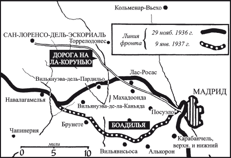 13 декабря на Мадридском фронте снова начались бои. Националисты решили продолжать наступление, первые попытки которого были предприняты десять дней назад. Цель его заключалась в том, чтобы, во-первых, отрезать республиканцев от Гвадаррамы и, во-вторых, окружить Мадрид с севера2. В ходе сражения националисты стремились выйти к дороге Мадрид – Ла-Корунья, что пролегала в нескольких милях от Эскориала. Оперативное управление осуществлял недавно назначенный командующий Мадридским фронтом генерал Оргас. Варела командовал на поле боя. Под его началом было примерно 17 000 пехотинцев и кавалеристов, собранных в четыре мобильные бригады Гарсиа Эскамеса, Баррона, Сайнса де Буруаги и Монастерио. Националисты, как обычно, начали с мощной артиллерийской подготовки, 14 декабря был взят небольшой городок на севильской равнине (в двадцати километрах от Мадрида) Боадилья-дель-Монте, над которым возвышался монастырь. Силы республики здесь состояли из нескольких разношерстных батальонов под командой майора Барсело, офицера республиканской армии, который, как и многие профессиональные военные, присоединился к коммунистической партии, привлеченный ее дисциплиной. В бой вступил резерв – советские танки генерала Павлова и обе интербригады. Батальону Тельмана и Батальону Парижской коммуны были приданы два подразделения англичан. Взводы Корнфорда и Ромилли впервые встретились под дубовыми деревьями вдоль дороги на Боадилью. Националисты отступили из Боадильи. Ее заняли батальоны Тельмана и Домбровского, затем их окружили мятежники. Начался жестокий бой, в котором обе стороны несли большие потери. На улицах городка остались лежать семьдесят восемь павших бойцов интербригад. Из десяти оставшихся англичан, приданных Батальону Тельмана, в живых осталось только двое3. Один из них был Эсмонд Ромилли, другой – Берт Овенден4, коммунист из Стокпорта. Рядом с соседним замком герцога Суэски завязалась жестокая рукопашная схватка. Замок удерживали республиканцы, члены гражданской гвардии, которые отступили, оставив после себя сотню трупов. Националисты, взяв Боадилью и Вильянуэву-де-ла-Каньяду, продвинулись на восемь километров к северу и остановили наступление.