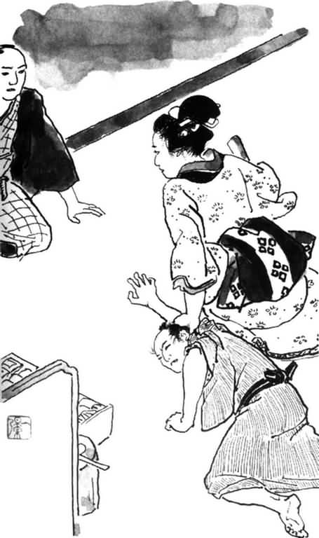 Мио тоже смотрела мимо него на приглушенно поблескивавшую поверхность черной чашки, которую муж держал в руках. С некоторых пор эти двое избегали смотреть в лицо друг другу даже дома. В тот момент, когда легкий ветерок снова шевельнул плетеную калитку на задах усадьбы, Мунэнобу впервые за долгое время поднял глаза и пристально посмотрел прямо в лицо Мио, а затем молча указал подбородком в сторону калитки: