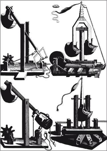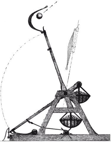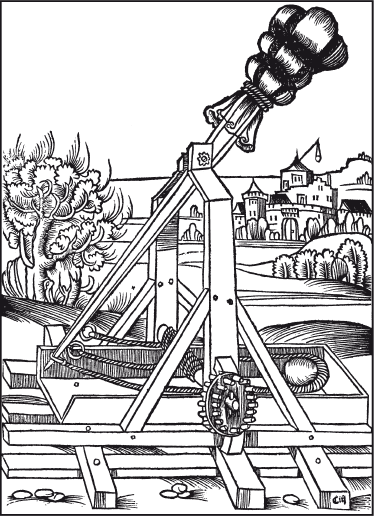 Рис. 23. Требучет в действии, выбрасывающий снаряд