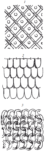 Рис. 12. Ромбовидный доспех, хауберк и плетеная кольчуга: 1 – образец решетчатого доспеха. Он изготавливается и из стеганой ткани, и из кожи, усиливается полосками толстой кожи, расположенными так, что они образуют решетку, внутри каждого квадратика заклепанная шляпка гвоздя. На иллюстрациях такой доспех трудно отличить от других; 2 – образец чешуйчатого или черепитчатого доспеха. Броня состоит из чешуек металла, нашитых рядами на стеганую ткань или кожу так, чтобы частично перекрывать друг друга; 3 – образец кольчуги из заклепанных колец. Состоящая только из металлических колец кольчуга не имеет ни подкладки, ни изнанки
