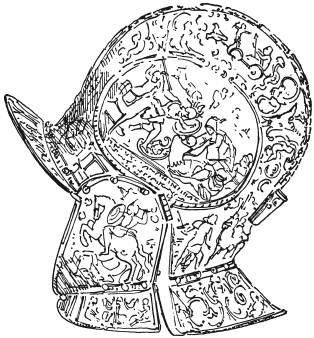 Рис. 13. Бургонет прекрасной итальянской работы; железо, чеканка, XVI в. Хранится в арсенале Вены, до этого находился в Люксембургском замке. Это один из лучших сохранившихся образцов