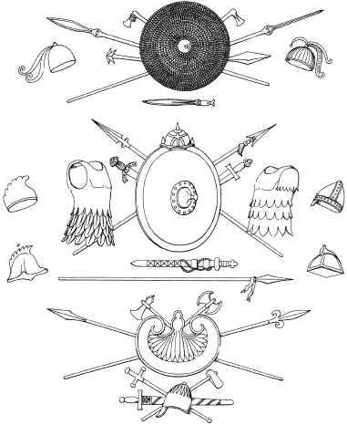Каска (casque). Известно два типа касок: «рогатая» модель приписывается скандинавам и бриттам, а коническая была в ходу у ассирийцев, аварцев, германцев, галлов и норманнов. Такие шлемы были всего лишь железными шапками.