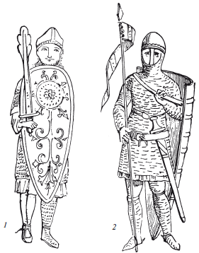 Рис. 15. Немецкие воины XI в.: 1 – оснащение немецкого воина XI в., со статуи одного из основателей собора в Наумбурге. Каска такая же, как в Золотом кодексе Сен-Галлена. Странно, но правая нога без доспеха. На подбородке видна борода; 2 – немецкий воин XI в. в хауберке с длинными рукавами. Капюшон, штаны, чулки кольчатые. Из Апокалипсиса Иеремии, библиотека Дармштадта